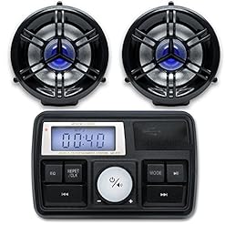GoldenHawk All-In-One 4″ Waterproof Bluetooth Motorcycle Stereo Speakers 7/8-1.25 in. Handlebar Mount MP3 Music Player Sound Audio System Scooter ATV UTV w/USB, Remote, Radio, Amplifier
