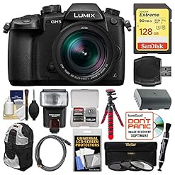 Panasonic Lumix DC-GH5 Wi-Fi 4K Digital Camera & 12-60mm f/2.8-4.0 Lens with 128GB Card + Backpack + Flash + Battery + Tripod + 3 Filters Kit