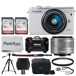 Canon EOS M100 Mirrorless Digital Camera (White) + EF-M 15-45mm f/3.5-6.3 is STM Lens (Graphite) + 32GB Memory Card + 49mm UV Filter + Quality Tripod + Memory Card Holder (24 Slots) + Cleaning Cloth