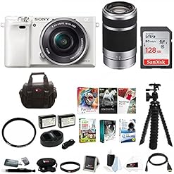 Sony Alpha a6000 Mirrorless Camera (White) w/ 16-50mm & 55-210mm Lens (Silver) and 128GB SD Card Bundle