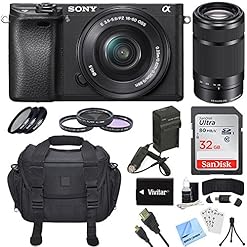 Sony Alpha a6300 ILCE-6300 4K Mirrorless Camera 16-50mm + 55-210mm Lens Bundle Includes a6300 Camera, 16-50mm + 55-210mm Zoom Lens, Filter Kits, 32GB SDHC Card, Beachcamera Cleaning Cloth and More!