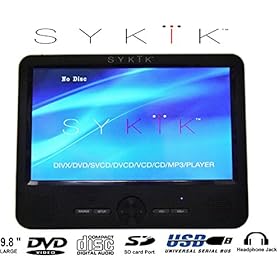 Sykik SYDVD196, 9.8” Inch All multi region zone free HD portable DVD player, USB, SD card slot, AC Adaptor, Car Adaptor, Remote Control (one year Sykik USA warranty) Black