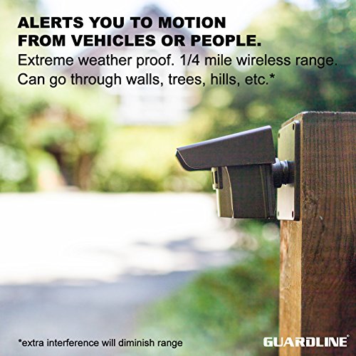 The Guardline 1/4 mile long range wireless driveway alarm is the perfect, easy to use, motion detector for your property. It runs on the included AC adapter and has a built-in battery backup and is easily placeable anywhere in your house. The compact receiver is simple to program and utilizes a loud chime and flashing LED lights when a sensor is tripped. The outdoor motion detector IR sensors come with protective coverings and an easy-mount bracket. Each set includes two sensors and one receiver (additional sensors and receivers can be purchased and added), offering you dual-zone coverage for your driveway, gate, home, or property.