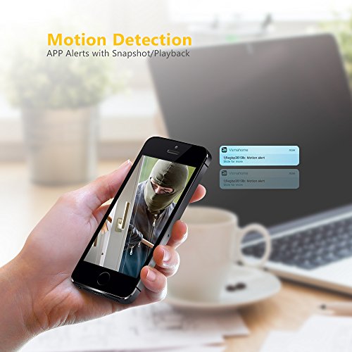 SMART MOTION DETECTION WITH TWO-WAY AUDIO:Powered by high accuracy motion detection technology,you can receive real-time snapshots and short videos by instant notification via app and email shortly after motion is detected.With the build-in high quality microphone and speaker,you can clearly hear what is going on and also talk to those on the other side of the camera.Great choice for security surveillance at home and in office