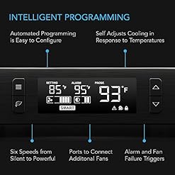 Programming includes a very easy-to-use thermostat and a SMART mode that mechanically adjusts the fan’s speed to react to varying temperatures. Additional features include alarm alerts, fan failure triggers, power savings setting, display lock, and backup memory. Six fan speeds are to be had with three screen brightness settings. At the back of the unit are ports that can keep an eye on up to six individual AC Infinity AIRPLATE Cabinet fans and MULTIFAN Component fans.