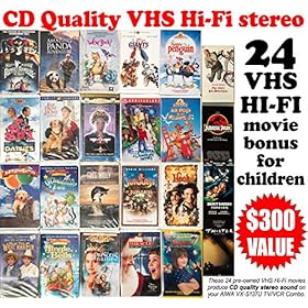 1 BLANK VHS TAPE & 24 VHS HI-FI MOVIE BONUS: Mighty Morphin Power Rangers, Amazing Panda Adventure, We’re Back!, Little Giants, The Pebble and The Penguin, Pee-Wee’s Big Adventure, Please Don’t Eat The Daisies, Far From Home, The Indian In The Cupboard, Willy Wonka & The Chocolate Factory, All Dogs Go To Heaven 2, Jurassic Park, Napoleon, O’Christmas Tree, Free Willy, Jumanji, Hook, Batman Without end, How The West Was Fun, Jingle Bells, Princess Bride, Miracle On 34th St, Matilda, Twister