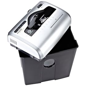 Cross-cut paper shredder with 12-sheet capacity; destroys credit cards, CDs, and DVDs (one at a time)