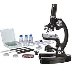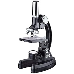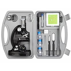 The AmScope M30-ABS-KT1 beginner compound microscope has a monocular viewing head with LED and mirror illumination, a built-in color-filter wheel, a forward-facing rotating turret with 300x, 600x, and 1200x magnification, and a black metal frame. The monocular viewing head has LED and mirror illumination and a built-in color-filter wheel for viewing a lot of specimen types. Coaxial coarse focus eases use for young users and has a rack-and-pinion focus mechanism for precise focusing. The plain stage has stage clips that safe the slide or specimen in place all through viewing. The black metal frame is durable and stain-resistant. The microscope comes with a 48-piece accessory kit and a hard-sided plastic carrying case. The LED light is powered by two AA batteries (included).