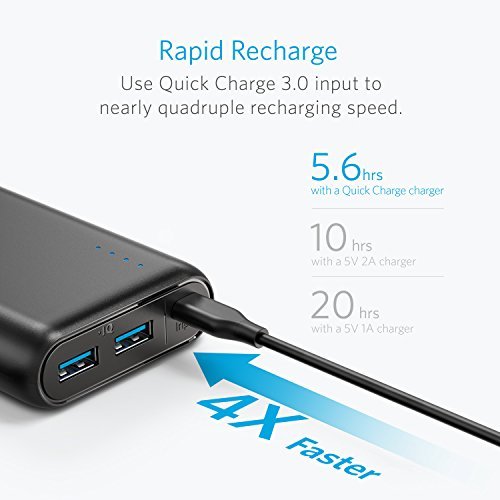 6-Hour Recharge: With Quick Charge input, a full recharge is over in half the time of standard portable chargers (wall charger not included).