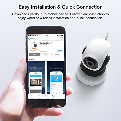 【Quick & Easy Installation】IP camera supports network cable or wireless installation. Quick respond code helps you get the operation App — EyeCloud and add camera promptly. Voice prompts and clear instruction show you how to set it up. Compatible with: IOS/Android, Windows, 2.4G Wi-Fi brand.