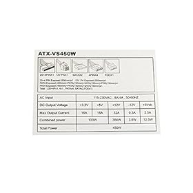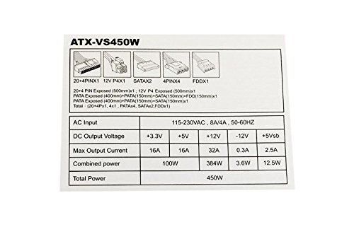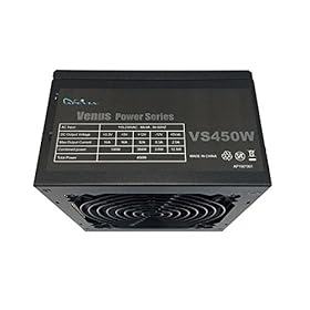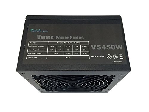 Apevia ATX-VS450W Venus Series 450W Power Supply with 1 x 120mm Low Noise Auto-Thermally Controlled Black Case Fans. 1 x 20 /24pin Main Power /1 x 12V(P4) / 2 x SATA/ 4 x Molex/ 1 x Floppy Connectors. 115/230V Switch, High Stability with 5% Tolerance of 5V, 3.3V & 12V Output. Max. Output Current +3.3V(16A), +5V(16A), +12V(32A), -12V(0.3A), +5Vsb(2.5A), Circuit/Over-Current/Over-Voltage/Over-Power/Under-Voltage/Over-Temperature Protections. High Quality Components. Very Stable and Reliable. For safety, do not overload, abuse or modify the power supply unit Use of this unit for Bitcoin Mining is not suggested since it will shorten the life and cause failures of power supply