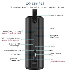 Aptoyu Bluetooth speaker we offer the top of the range with the recent Bluetooth technology means that you can enjoy top of the range music. Go and enjoy new Bluetooth transmission technology, built-in microphone and aux audio volume adjustable: Previous: Short press to back to the previous track, long press to decrease volume next/v+:Short press to the next track, long press to increase volume please refer to the “button function description” on the user instructions. Bluetooth transmission the Bluetooth technology, wireless Bluetooth, 33 feet, compatible with all Bluetooth compatible equipment (2.1 and higher). In a couple of seconds to connect peripheral Bluetooth, including iPhone, iPad, iPod, Samsung, kindle, smart phones, tablets and so forth. Powerful performance – 10w drivers top of the range dual 5w drivers, fashion & portable design with compact size, implemented with 10w total acoustic drivers and advanced bass enhancement technology, similar experience a full-bodies stereo sound with punching bass and powerful volume. Audio input play the audio from PC and laptop computers, 3.5mm aux can connect other non-Bluetooth device via 3.5mm port with a audio cable. Fortify TF card maximum Fortify capacity of 128g TF card playback, come up with an unusual music experience. Built-in battery thanks to the 3600 mah li-ion battery technology and power saving design, lets you stream music for up to 24 hours on a full charge with volume set up to 2/3 of maximum playing volume. Louder playing volumes will reduce the battery playtime package included Aptoyu Bluetooth speaker 3.5mm audio cable micro USB charging cable bag user manual.