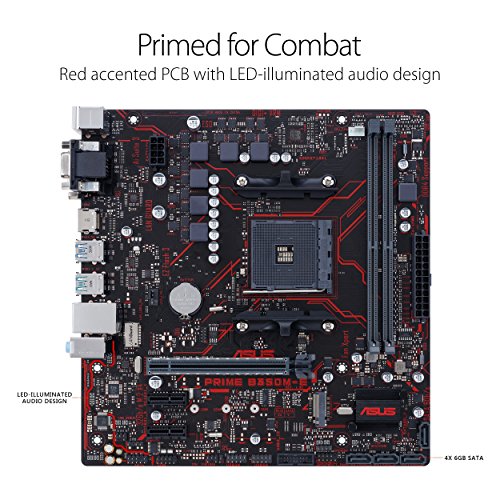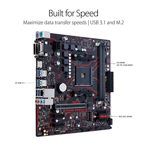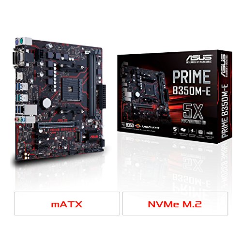 Powered by AMD Ryzen AM4 processors, the ASUS Prime B350M-E packs a punch with performance and reliability. Access next-generation connectivity and speeds with NVMe M.2, USB 3.1 Gen2, DDR4 support and Gigabit LAN. 5X Protection III ensures component longevity and reliability while Safe Slot adds protection for PCIe slots.