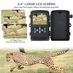 Short Trigger Speed & 2.4 Inch LCD screen: An impressively fast trigger speed of less than 1 second ensure each detected movement is captured quickly and appropriately, also documented in real time. User are guaranteed to never miss any of the action. The 2.4 inch LCD screen is perfect for replaying the pictures and videos.