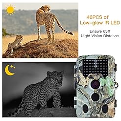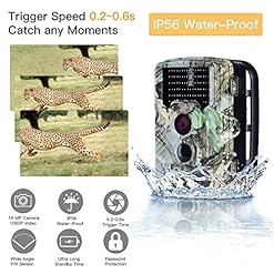 Low Glow Infrared Night Vision LEDs for Flash Range as Far as 65 Feet&IP56 Water Resistance. This black flash trail camera equips with widest 65ft detection range in hunting camera industry, you won’t miss what is walking in front of your camera even in the night. IP56 spray water protect design, it is in a position to work in tough environments like tropical rain forest.