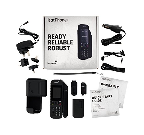 EVERYTHING YOU NEED INCLUDED: Inmarsat IsatPhone 2 satellite phone handset, Lithium-ion battery, International AC wall charger with international plugs, Automobile DC charger, Holster with belt clip, Hands free earpiece, Lanyard, USB cable, USB thumb drive with documentation, Quick start guide, BlueCosmo SIM card & 1 year manufacturers warranty.
