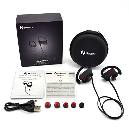 Bluetooth Headphones, Hussar Magicbuds Wireless Headphones, IPX4 Sweatproof, Premium Sound with Bass, Noise Cancelling, Ergonomic Design, Secure Fit, Zippered Case, 7 Hrs Playtime with Mic
