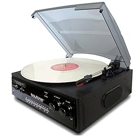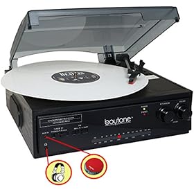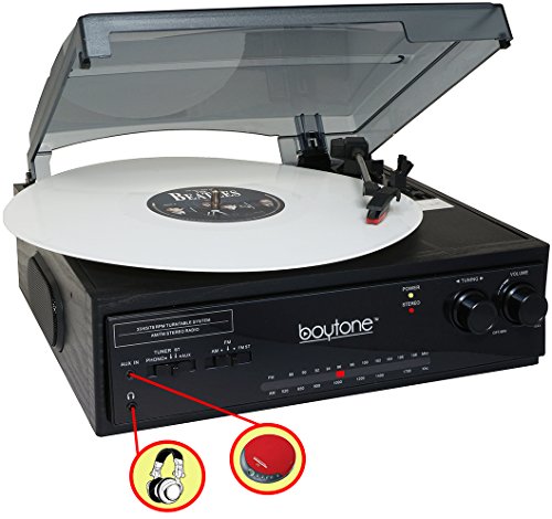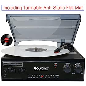 Boytone BT-13B, with AM,FM radio Bluetooth Connection, belt-driven turntable spins, 7, 10 or 12-inch records at speeds of 33, 45 & 78 RPM so you can enjoy all the records. Including Turntable Anti-Static Flat Mat.
