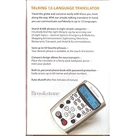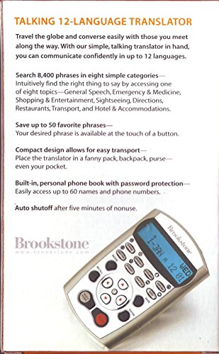 Where shuttle guides end, the Brookstone begins! This talking translator is sufficiently small to slot in your pocket, and accommodates many shuttle-related phrases in 12 different languages. Eight conversational categories let you find your desired phrase quickly, and the Brookstone both speaks and displays the translated phrase. You also be able to save steadily used phrases. This pocket translator gives you confidence when communicating in a foreign language. This handheld translator is the up to date answer to paper dictionaries. This device cross-translates 12 international languages: English, French, German, Spanish, Italian, Turkish, Dutch, Russian, Portuguese, Japanese, Mandarin Chinese, and Swedish. Cross-translate 12 international languages the use of many built-in phrases Auto power off, volume selection and reset button Handheld electronic translators are the up to date answer to paper dictionaries Device speaks the foreign phrases aloud Integrated alarm clock and data bank with password lock