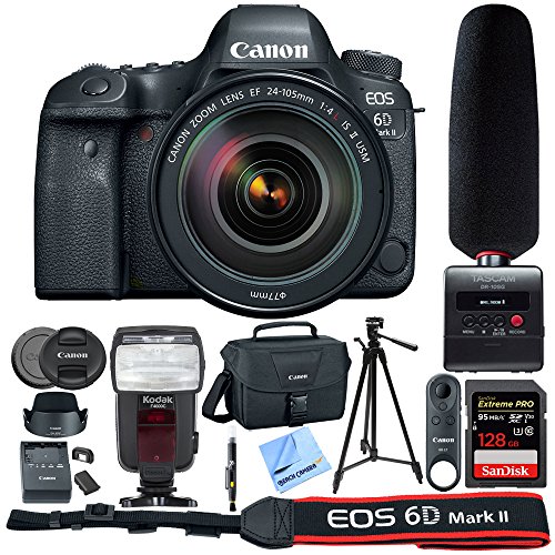 Canon EOS 6D Mark II 26.2MP Full-Frame DSLR Camera w/24-105mm IS II USM Lens (1897C009) + Tascam DSLR Audio Recorder w/Shotgun Microphone + 128GB Memory Card + Power Zoom Flash + Camera Bag + More