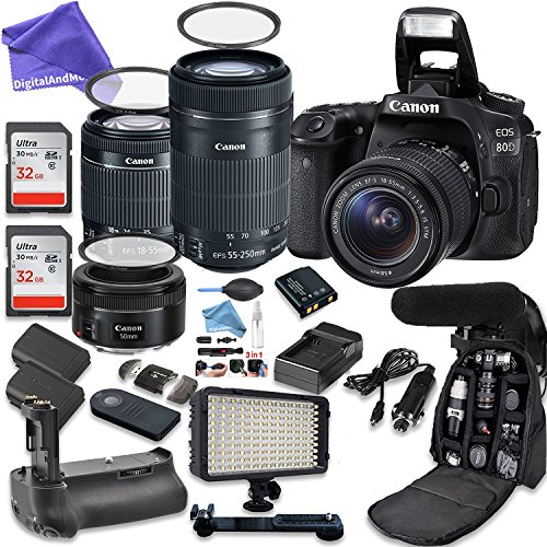 ➤ Canon BUNDLE Includes: Canon EOS 80D 24.2 MP CMOS Digital SLR Camera + Canon EF-S 18-55mm f/3.5-5.6 IS STM Lens + Canon EF-S 55-250mm f/4-5.6 IS STM Lens + Canon EF 50mm f/1.8 STM Lens + Vertical Multi-Power Battery Grip + 2 32 GB High Speed SDHC Class 10 Memory Cards + Deluxe Camera Backpack Case for DSLR Cameras ——>>>>>
