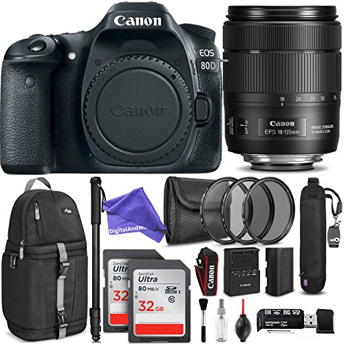 ➤ Canon BUNDLE Includes: Canon EOS 80D 24.2 MP CMOS Digital SLR Camera + 18-135MM Lens + DSLR & Mirrorless Camera Monopod + Photo Mini Tripod with Pistol Grip for DSLR + 32GB Ultra UHS-I SDHC Memory Card (Class 10) + Photo RAPID FIRE Quick Release Neck Strap for Digital Camerap + Photo 67mm 3 Piece Filter Kit (UV-CPL-ND4) + SD USB Card Reader Adapter + Photo Cleaning Kit + Premium DigitalAndMore Microfiber Cleaning Cloth