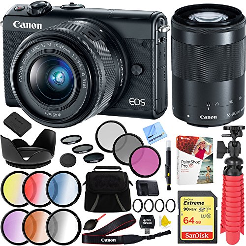 BUNDLE INCLUDES: EOS M100 Camera (Black) | EF-M 15-45mm f/3.5-6.3 IS STM | EF-M 55-200mm f/4.5-6.3 IS STM Lens | 64GB Extreme SDXC Memory UHS-I Card | Compact Deluxe Case | 12-inch Rubber Spider Tripod | 49mm Graduated Color Multicoated 6 Piece Filter Set with Case | 49mm Close Up Lens Set with Filter Wallet +1 +2 +4 +10 (Black) | 3-Piece Filter Kit 49mm UV/CPL/ND8 | Pro Hard Tulip Lens Hood 49mm | Corel PaintShop Pro X9 Digital Download | Accessories Kit | Professional Lens Blower & More