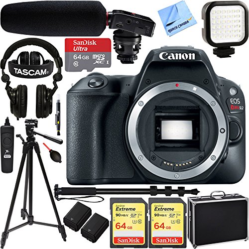 Canon EOS Rebel SL2 24MP DSLR Camera (Body) – Black w/Tascam DSLR Audio Recorder and Shotgun Microphone + 128GB & 64GB Pro Video Bundle (Pro Audio Video Recording Bundle)