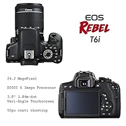 Canon EOS Rebel T6i – 24.2 MP APS-C CMOS Sensor, DIGIC 6 Image Processor, 3.0″ 1.04m-dot Vari-Angle Touchscreen, Full HD 1080p Video Recording at 30 fps, 19-Pt. Cross-Type AF, Hybrid CMOS AF III, Expanded ISO 25600, 5 fps Shooting, 7560-Pixel RGB+IR Metering Sensor, EOS Scene Analysis, Built-In Wi-Fi Connectivity with NFC.