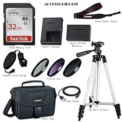 The bundle also includes, Canon battery, Canon charger, Canon neck strap, 32 GB High speed memory card, 50 Inch tripod and more.