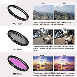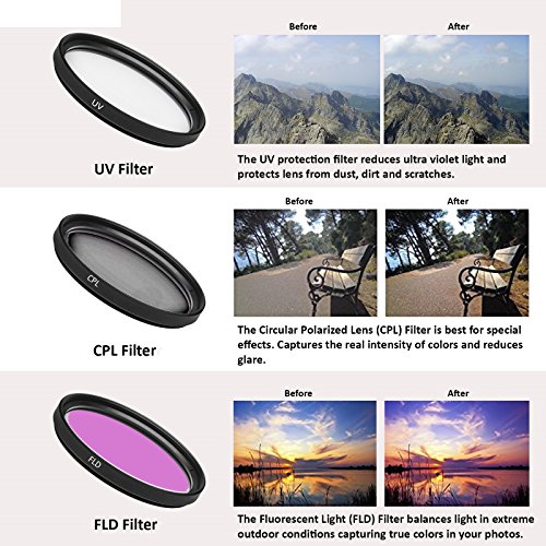 3 Piece HD Filter Kit includes 1x UV filer – Reduces ultra violet light and protects lens from dust, dirt and scratches, 1x CPL Filter – Best for special effects. Captures the true intensity of colors and reduces glare, 1x FLD Filter – Balances light in extreme outside conditions capturing true colors to your photos.