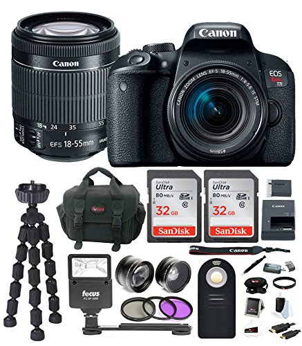 Whether you are a beginner who wants to graduate from point-and-shoot to the world of digital SLR or available in the market for updating your existing DSLR, the Canon EOS Rebel T7i is a great choice. At the same time as it may look similar to its predecessor, the EOS Rebel T6i, the EOS Rebel T7i from Canon is loaded with significant upgrades. It features a 24.2-megapixel sensor and a 45-point autofocus system that delivers robust images and near-instant precision autofocus whether you’re capturing portrait or landscape photography or taking vacation photos of family and friends. Take your photos to a whole new level of image quality with the EOS Rebel T7i DSLR camera from Canon. Closing the high resolution and low-light performance gap between it and its competitors, the Canon EOS Rebel T7i features Canon’s all new 24.2MP CMOS APS-C Sensor. This powerful sensor produces images with unbelievable depth and beauty and boasts a high resolution permits you to capture superior quality images in virtually any lighting environment. Whether you take high resolution 24-megapixel photos or recording HDR videos at 60 fps, you’ll expect to catch all of the bits and bobs in brilliant color from deep reds, to emerald greens to lush blues and purples. Shoot with confidence knowing that your high resolution creations will look stunning whether you’re sharing them on the Web or blowing them up to poster sized prints. Bundle Includes: • Canon EOS Rebel T7i DSLR Camera w/ EF-S 18-55mm IS STM Lens • Focus Flash w/ Wide/Tele Lenses & 58mm Filters for Canon • Focus DSLR Accessory Kit w/ Mini HDMI Cable • Focus Flexible 10″ Spider Tripod • Two SanDisk Ultra 32GB SD Card • Top Brand Infrared Wireless Shutter Release Remote Keep an eye on Canon DSLR Cameras