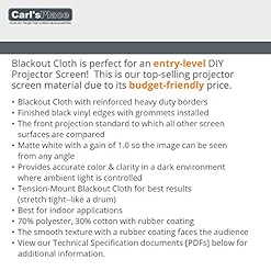 Blackout Cloth is our top-selling Projector Screen Material making it a budget-friendly, do-it-yourself screen building favorite! This front projection blackout fabric surface is the usual to which all other screen surfaces are compared.