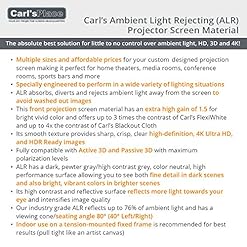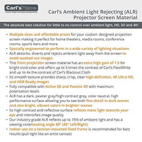Ambient Light Rejecting (ALR) Projector Screen Material is the very best solution if in case you have little to no regulate over ambient light concerns! Beautifully handles a dark, low or slightly lit environment. Provides high contrast, vibrant color, HD, 3D images and is 4K Ultra HD/HDR Able- it almost does it all! Indoor use on a tension-mounted fixed frame is beneficial for best results (pull tight like an artist canvas)
