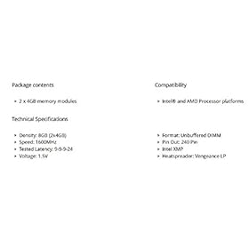 CORSAIR high performance Vengeance memory module 8GB (2x4GB) 1600MHz 9-9-9-24, 1.5V for motherboards using AMD, Intel dual channel platforms. These Vengeance modules are designed for high-performance systems with extra-large CPU coolers, small form factor system builds, or other space-constrained applications that prevent the use of standard Vengeance memory. Each module is built using carefully selected DRAM to allow excellent overclocking performance, and has a limited lifetime warranty.