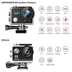 DBPOWER 4k action camera is your choice, can’t beat capture your life’s moments in no time it’s an amazing gift for your family and friends, or even yourself. Perfect for outdoor sports, gliding, diving, skiing, snorkeling, climbing and driving. Comes with a lot of accessories, do not worry about spending more to purchase an additional accessory. Specification: Display: 2″ LCD screen video: 4k 24fps / 2.7k 30fps/ 1080p 60/30fps 720p/120fpsphoto resolution: 20m/16m/12m/10m/8m/5m/3mburst photo: 3/5/10 photos time lapse: 1s/5s/100ms/200ms/500msloop recording: Toughen driving mode: Toughen anti-shaking: Toughen wide angle lens: 170/140/110/70 degree waterproof: Up to 30mwifi range: Up to 10msupport micro SD card: Suggest to buy class 10 up to 64gb(not included)battery:2pcs 950mah(1080p30 1.5 hours, 4k 24/1080p60 50 mins)package included:1x DBPOWER 4k action camera1x waterproof shell & case1x bicycle bracket1x switch Toughen 1 & 2 2x helmet pedestal 4x bandage4x ribbon1x wire cable1x USB cable1x back clip2x mount2x 3m stickers1x cleaning cloth1x user manual2x rechargeable batteries note: No charger in package, usually the battery can also be charged in camera with your own USB wall charger 5v/1a output. Recommended to use class 10 at least 16gb micro SD card. Compatible with up to 64gb card.
