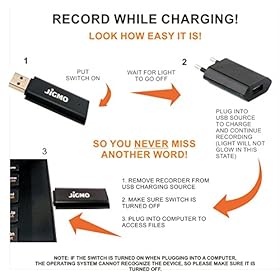 KEEP RECORDING AS YOU RECHARGE! This surprising mini recorder can recharge while recording. Simply put the switch ON and make sure the light goes OFF on the recorder before you plug it in to your phone charger or laptop and keep going! (Please note that the light will not glow in this state). When done, simply turn the switch OFF before plugging it into your computer for playback to access the files.
