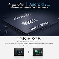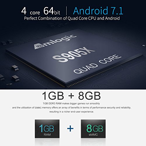 [Android 7.1 OS & Advanced Configuration] Runs on the up to date Android 7.1 Nougat System, and powered by Amlogic S905X Quad-core CPU, including Penta-Core ARM Mali-450 GPU, which is perfect in productivity, stability and performance, delivering an improved user experience.