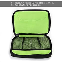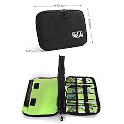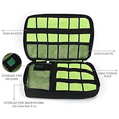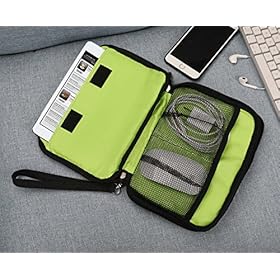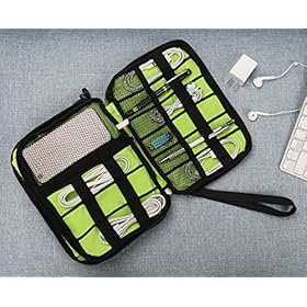 LARGE CAPACITY: Keeps things organized. The electronics storage bag has 2 layers Nylon interior compartment with enough space to absorb your cables, USB drive, cellphone, charger, mouse, kindle, mini tablet and other accessories. STRUCTURE: 6 elasticized mesh segments for usb drive, 2 Mesh pocket for chargers cellphones, 12 elastic loops for cables, 1 SD/TF card storage segment, 1 big adhesive pocket for tablet iPad mini, 1 detachable hand strap.