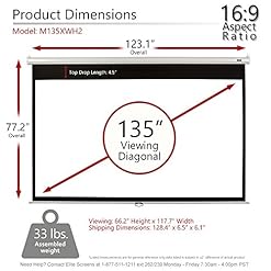 135-inch Diagonal, 16:9 Aspect Ratio. View Size: 66.0″ H x 117.3″ W. Overall Size: 77.2″ H x 123.1″ W. White Case