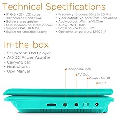Includes matching headphones and bag. 9 in. transportable DVD player bundle. 180deg screen swivel and tilt. Built-in stereo speaker and rechargeable battery. Guaranty: 90 days portions and labor.