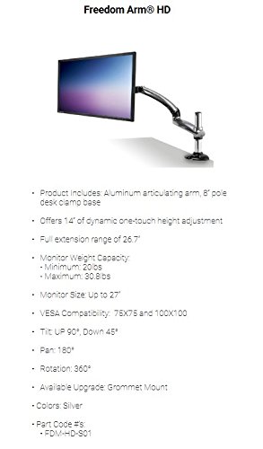 The Freedom Arm “Heavy Duty” is an Articulating LCD Monitor Arm that easily mounts to any usual desk allowing you to disencumber valuable desk space. Holding from 20lbs to 30.8lbs, the Freedom Arm HD offers 120 dynamic one-touch height adjustment and a full extension range of 26.7″. With a tilt range 90 up and 45 together with full 360 rotation and 180 pan, the Freedom Arm gives your PC or iMac the flexibility it needs & deserves to transport freely around your workspace!
