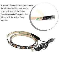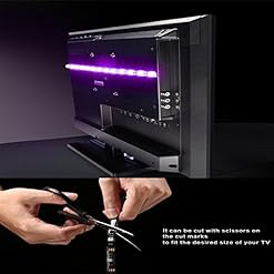 Easy Installation – 35.4” Strip + 46.45” USB cable + A Spare 3M Adhesive Tape , High brightness 30 quality LEDs, Cut the Led Strip with Scissors On the Cut Marks (White Lines), NOTE: Don’t cut the light too short, it must be long enough to be placed in the midst of the back of your tv, Please refer to the 4th image!; Remove the adhesive backing on the strips. Firmly Press the strips to the rear of your tv approx. in the center between top and bottom, then connect the USB TO USB port.