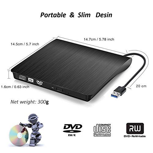 [CLASSIC APPEARANCE, USB 3.0 INTERFACE] The CD/DVD drive and the USB cable are combined in one. Embedded USB cable design, easy for storage. Ultrl Slim portable size is equipped with USB 3.0 high speed interface, bringing you faster data transfer speed and stable performance, compatible with USB 2.0 and USB 1.0