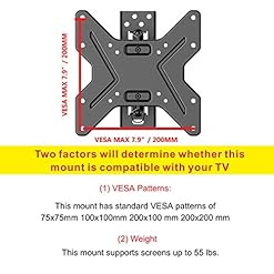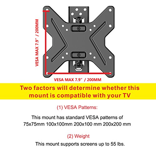 Check your TV’s wall mount pattern size (VESA Size) before you purchase any TV wall mount. Available VESA Size: 75x75mm(3″x3″), 100X100mm(4″x4″), 200X100mm(8″x4″), 200X200mm(8″x8″).