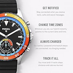 Meet Q Crewmaster, our yacht-inspired hybrid smartwatch that blends analog design with smart connectivity. Fastened in an accordion black silicone strap, the Q Crewmaster features stick indices and a two-tone rotating timing bezel. The usage of Bluetooth technology, receive smartphone notifications and accomplish daily fitness goals when the hour, minute and sub-eye hands spin or the watch case vibrates. Set an alarm, view 24-hour time, compare time in a couple of time zones and track everything from steps to calories to sleep. Press the bottom pusher to take a photo, keep an eye on music or find your phone with the assistance of our Fossil Q App. Customize your look with interchangeable straps. Q Crewmaster’s sportsmanship and smart functionality makes for the easiest (high seas) companion.