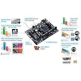Socket FM2+ supports AMD FM2+/FM2 A-series APU GIGABYTE Ultra Durable Technology Dedicated audio hardware zone with Audio Noise Guard design HDMI 1.4, D-sub ports for multi-display support Native USB 3.0 and SATA3 ports with RAID support GIGABYTE UEFI BIOS GIGABYTE On/Off Charge for USB devices Solid capacitors for APU VRM design
