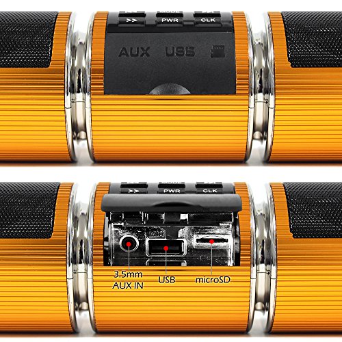 3.5mm Audio Jack AUX IN Available. Support USB and microSD Card MP3 files. (USB Charging NOT Supported). FM Radio. Clock Display.