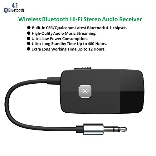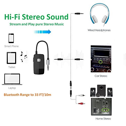 Featured Bluetooth V4.1+EDR : Advanced CSR 4.1 chipset combining A2DP comes with stable connectivity and remarkable signal stability. Non-stop and clear HiFi music streaming creates enjoyable listening experience.Ideal to be used for your headphones,home sound system,car stereo and portable non-bluetooth device via the 3.5 mm or 2.5 mm RCA audio connector.