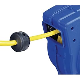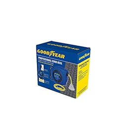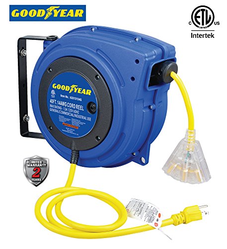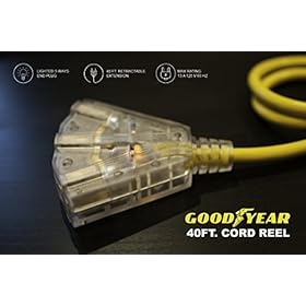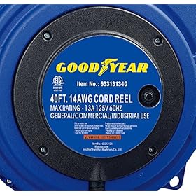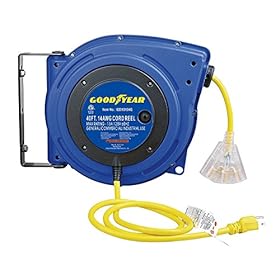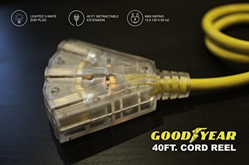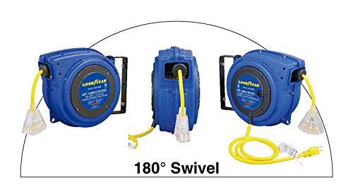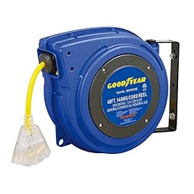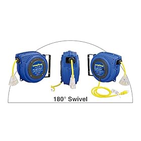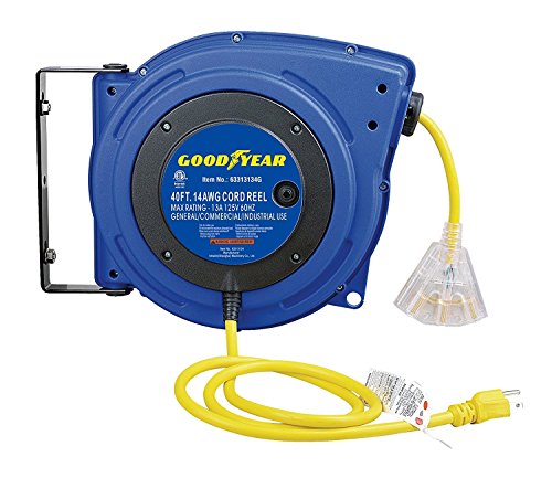 The Goodyear 63313134G Heavy Duty Extension Cord Reel includes a 40 ft., 14AWG/3C SJTOW, Triple Tap cord that permits you to have power when and where you wish to have it. The spring driven retractable feature with latch helps to keep the cord where you wish to have it when in use and quickly store it away when finished. The affect resistant polypropylene case with attached swivel bracket may also be attached to walls or ceilings helping you keep electrical cords out of the best way when not in use. 60 in. lead in cord is included.